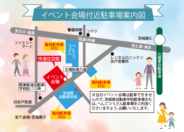 駐車場:茨城県自動車学校、へんこつうどん、ご近所 130台